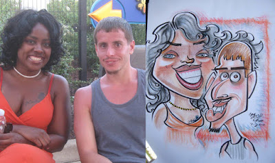 17. not as happy with the likeness of the guy/made his neck too thick but I liked how the layout came together on this. got the background shape idea from seeing something fellow caricaturist and friend, Sam Gorrie, did in one of her sketches. the background color combo were the colors of the girl's sneaks. usually I draw too big, and think these were good sizes. they were really cool and liked the sketch, and bought a frame with it. then they sucked and returned the frame later on when I wasn't there (still bought the sketch) cause she said she "needed money to eat or she would throw up" which makes no sense. whatever.
